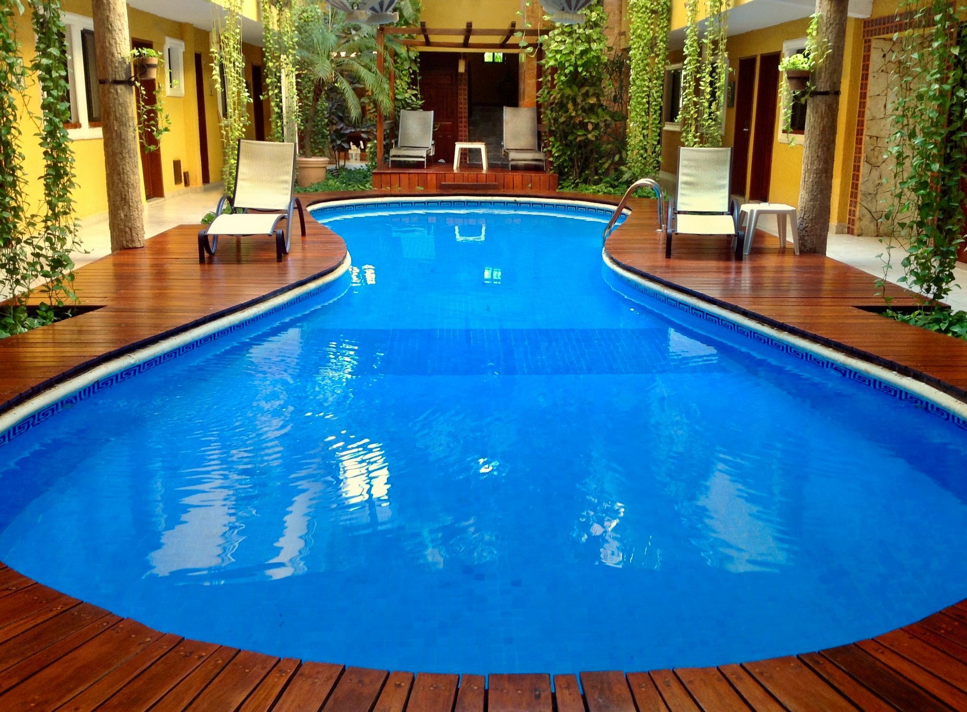 La piscina principal ubicada en el centro del hotel rodeada por un deck de madera, camastros y vegetación tropical entre palmeras.